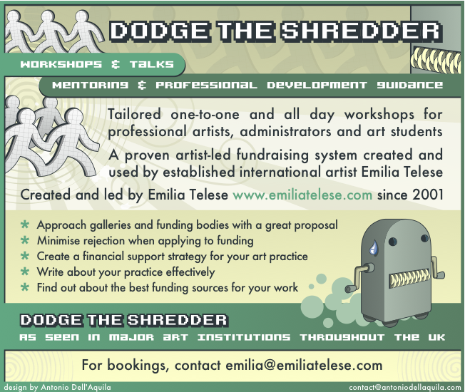 Dodge The Shredder is a workshop that teaches artists how to fundraise effectively and create a financial strategy for their practice. I created Dodge The Shredder while managing the Artists’ Resource at Fabrica, the largest resource for artists’ professional development in the South East of England. Working for over six years creating the library, I noticed that the most frequently asked question was how to fundraise for your work. Many artists were frustrated at not having a strategy for this, and so I created a system based on my way of doing it.
